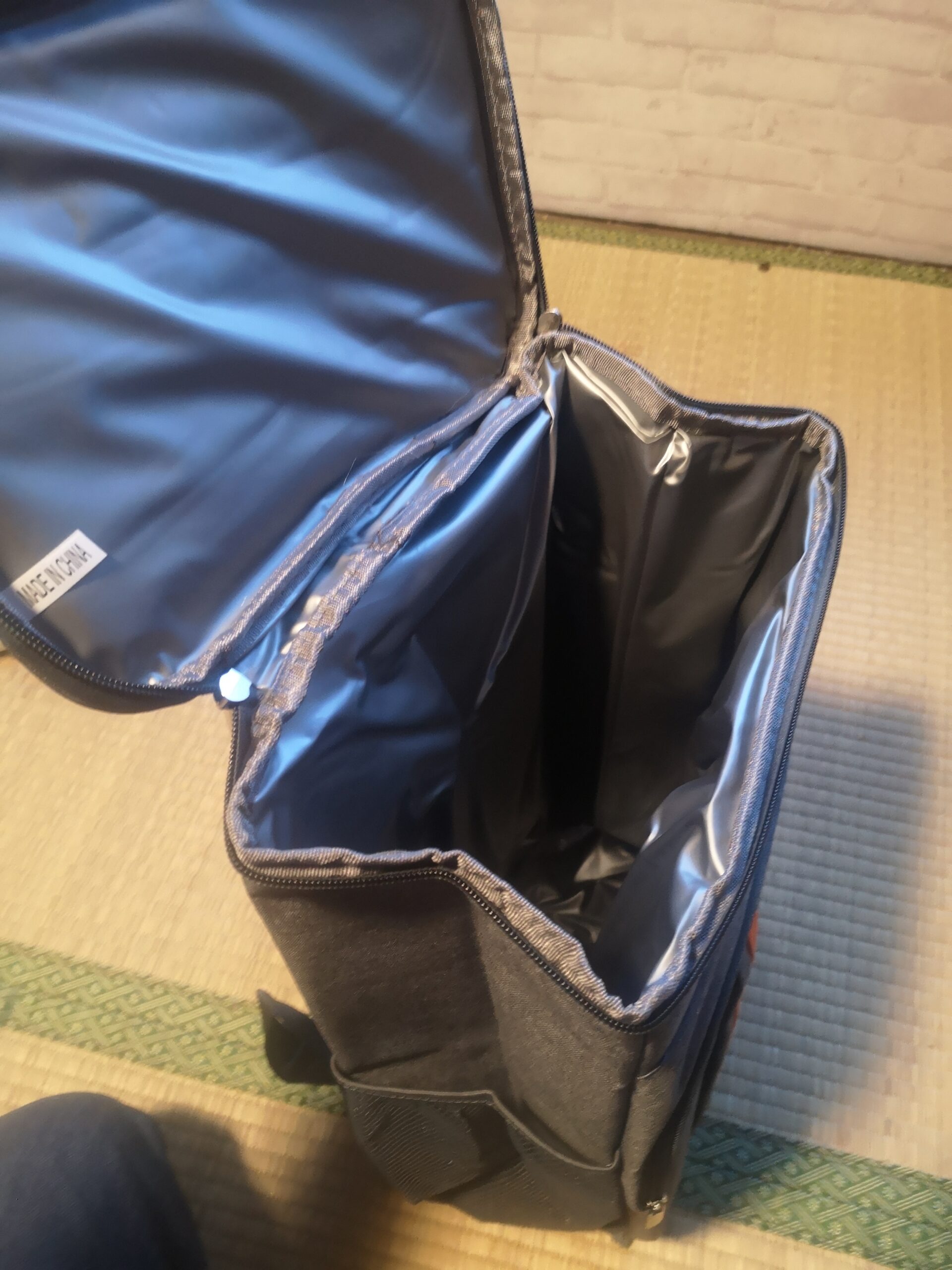 内側を覗くと、PEVA素材のシルバーの層がしっかり貼られており、縫い目の処理も丁寧。防水性が高いと書かれていましたが、手触りからもそれがわかります。