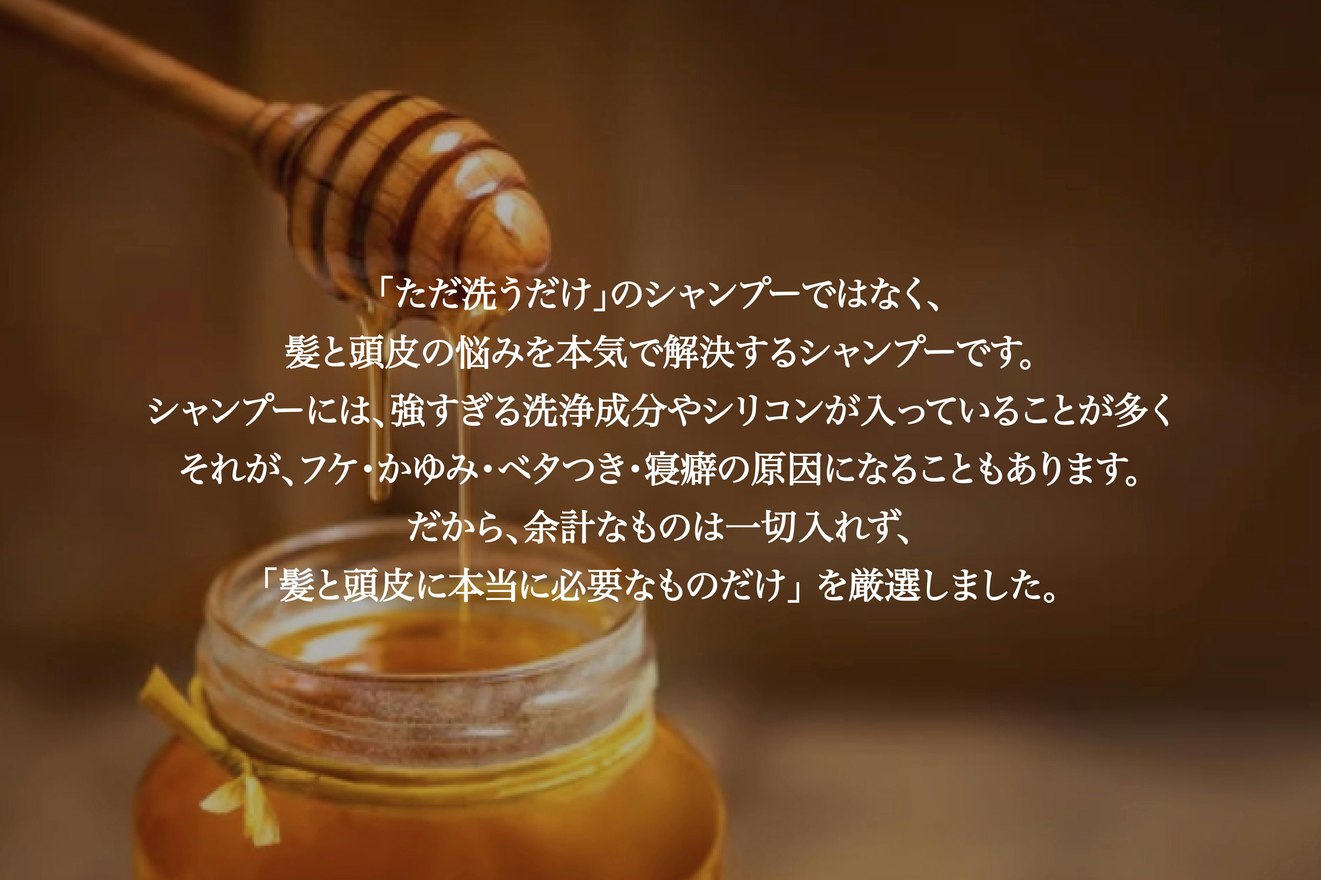 使われているのは、自然素材の代表格「はちみつ」。それをベースに、頭皮と髪に優しい石けん成分で仕上げたシャンプーなんです。しかも、開発したのは“男性の髪と頭皮を本気で考えた”プロフェッショナルたち!